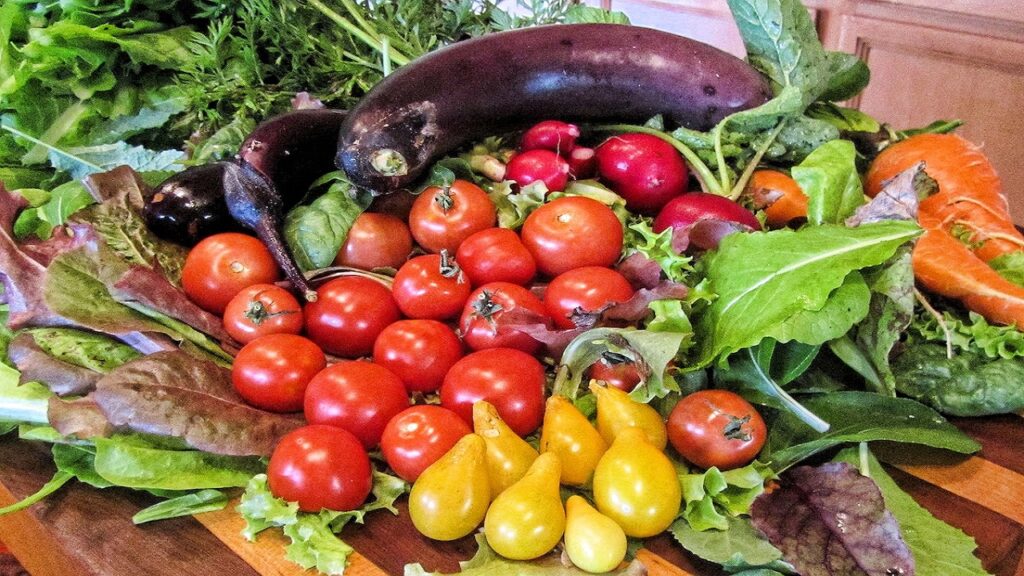 Buğday, arpa, çavdar gibi kepekli tahıllar lif, vitamin ve mineral bakımından zengindir ve genellikle ekmek, makarna veya tahıl halinde sofralarda yer alır. Baklagiller, protein ve lif kaynağı olmaları nedeniyle de beslenme tarzında sıkça kullanılır. Sebzeler ve meyveler, Akdeniz diyeti için vazgeçilmez parçadır. Domates, biber, salatalık, enginar, ıspanak gibi sebzeler sıkça tüketilir. Buna ek olarak portakal, üzüm, incir, avokado gibi meyveler bolca tüketilir.